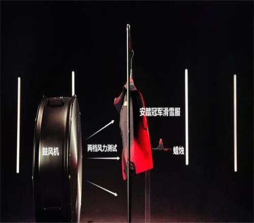 圖注:防風測試中,安踏冠軍開山雪服V3置于鼓風機與蠟燭之間,半包圍護住燃燒的蠟燭