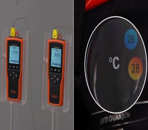 圖注:測溫儀和衣物內置體溫計數(shù)值一致,