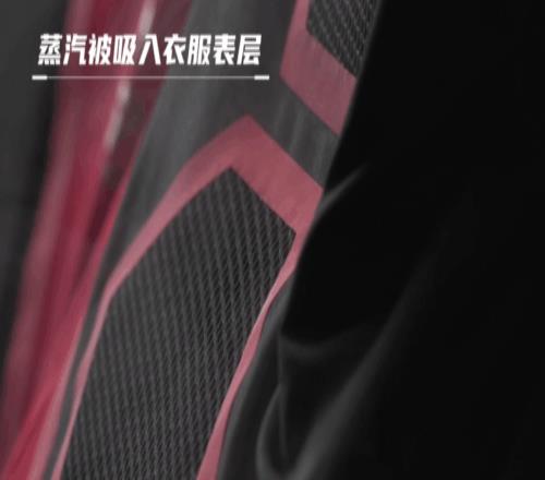 在我們的實驗中,用掛燙機產生大量水蒸汽,可以看到蒸汽被吸入背部[1+6]仿生蜂巢透汽陣列,并從后背的透汽窗和腋下拉鏈高效排出。