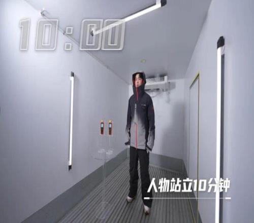 在實驗中,由模特穿著安踏冠軍滑雪服,站在-20℃的環(huán)境中待著10分鐘,滑雪服內置的溫度計顯示溫度變化并不大,服裝內微環(huán)境的溫度最終保持在26-28℃。