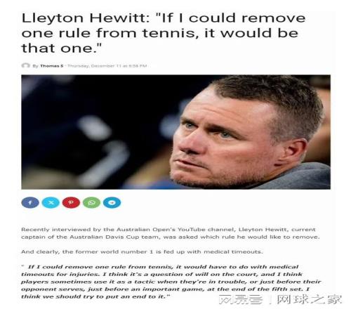 澳大利亞網球名宿休伊特近日在澳網官方采訪中直言不諱,他公開呼吁,應該廢除網球比賽中的傷病暫停規則。